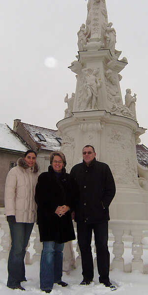 „Die Dreifaltigkeitssäule auf dem Hauptplatz von Ebenfurth wurde 1713 unter Ferdinand Ignatius Unverzagt errichtet. Dieses barocke Kleindenkmal wies erhebliche Schäden auf: So waren neben einer Oberflächenverschmutzung und einem organischen Schädlingsbewuchs insbesondere weit reichende Risse, Absprengungen und Abplatzungen fest zu stellen. Manche Gesims- und Volutenteile erwiesen sich als akut absturzgefährdet, die Salzbelastung war bis 2 Meter Höhe sehr stark. Eine Restaurierung der Dreifaltigkeitssäule war daher nötig. Dabei wurde das Denkmal gereinigt, gefestigt, entsalzen, Armierungen wurden zum Teil ausgetauscht, Ergänzungen appliziert, Vergoldungen erneuert und das Objekt abschließend geschlämmt. Die Arbeiten wurden im Sommer des Vorjahres bereits abgeschlossen“, weiß Bohuslav.