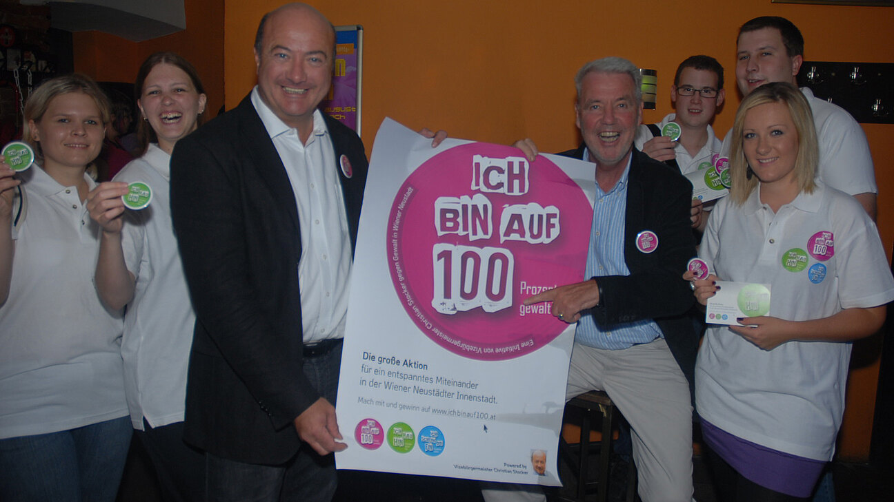 Am Freitag ist das Team von „Ich bin auf 100“ zum vorerst letzten Mal mit Buttons, Flyer und Fotoapparat in der Wiener Neustädter Innenstadt unterwegs gewesen. Diesmal mit hochkarätiger Unterstützung. Klubobmann Klaus Schneeberger hat sich gemeinsam mit Vizebürgermeister Christian Stocker unter das Partyvolk gemischt, um für eine gewaltfreie Innenstadt zu werben.