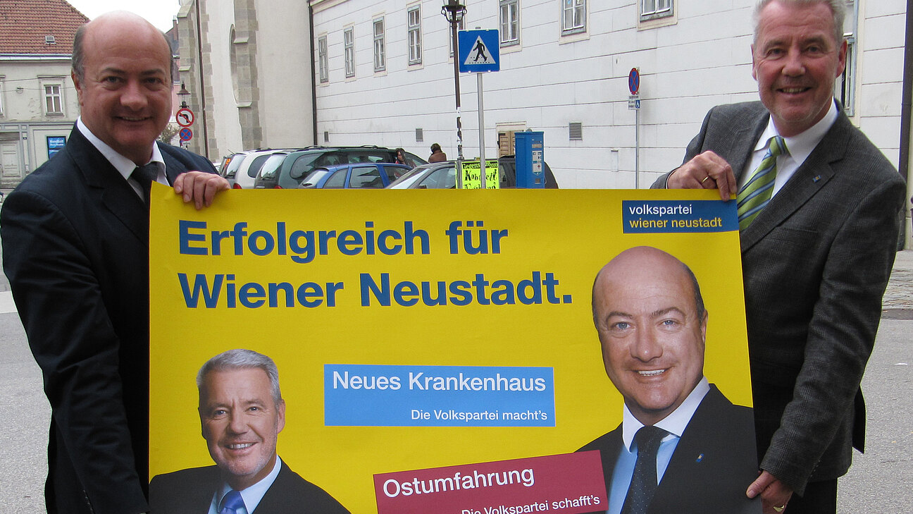 Heute, Freitag präsentierten VPNÖ-Klubobmann LAbg. Mag. Klaus Schneeberger und VP-Vizebürgermeister Christian Stocker die Plakatkampagne „Erfolgreich für Wiener Neustadt“, wo auf die vielen Projekte aufmerksam gemacht wird, die Klaus Schneeberger und Christian Stocker für die Wiener Neustädterinnen und Wiener Neustädtern zugute kommen. Vom Neubau des Landesklinikums, der Errichtung von MedAustron und dem Betreuten Wohnen, über die Schaffung zusätzlicher Kindergartengruppen bis hin zum Bau des Tierschutzhauses und des Rings um Wiener Neustadt.