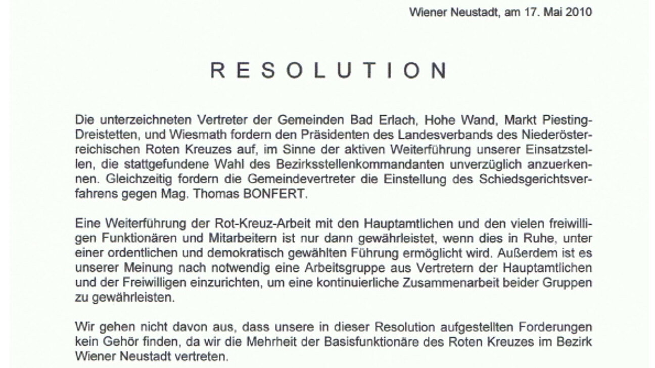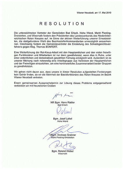 Die unterzeichneten Vertreter der Gemeinden Bad Erlach, Hohe Wand, Markt Piesting-Dreistetten, und Wiesmath fordern den Präsidenten des Landesverbands des Niederöster-reichischen Roten Kreuzes auf, im Sinne der aktiven Weiterführung unserer Einsatzstel-len, die stattgefundene Wahl des Bezirksstellenkommandanten unverzüglich anzuerken-nen. Gleichzeitig fordern die Gemeindevertreter die Einstellung des Schiedsgerichtsver-fahrens gegen Mag. Thomas BONFERT.